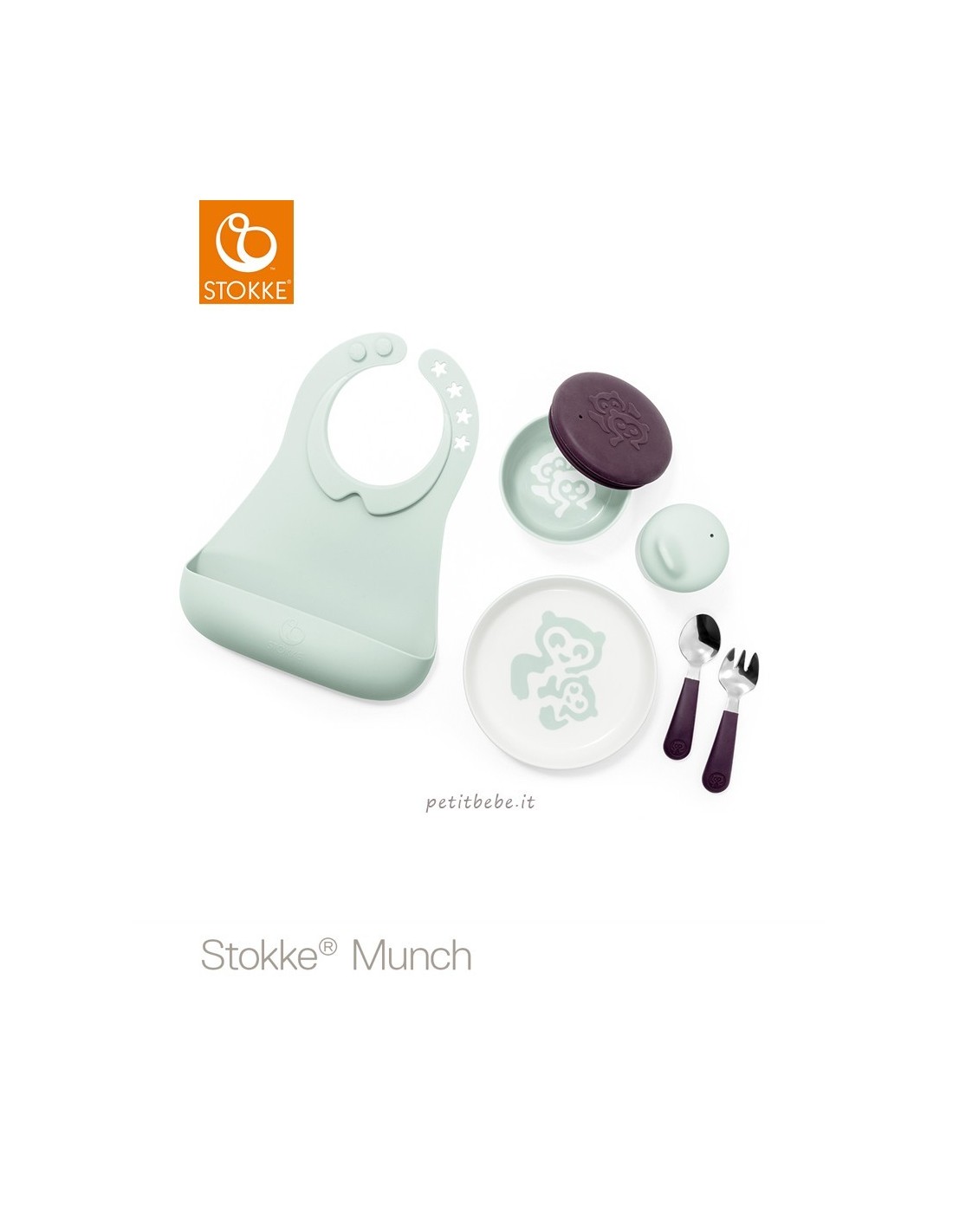 Stokke Munch Set Completo è la soluzione pratica e ideale per affrontare il momento della pappa in totale tranquillità. E' composto da bavaglino impermeabile,utensili ergonomici,un piatto salvaspazio, un bicchiere e una ciotola con coperchio antigoccia.