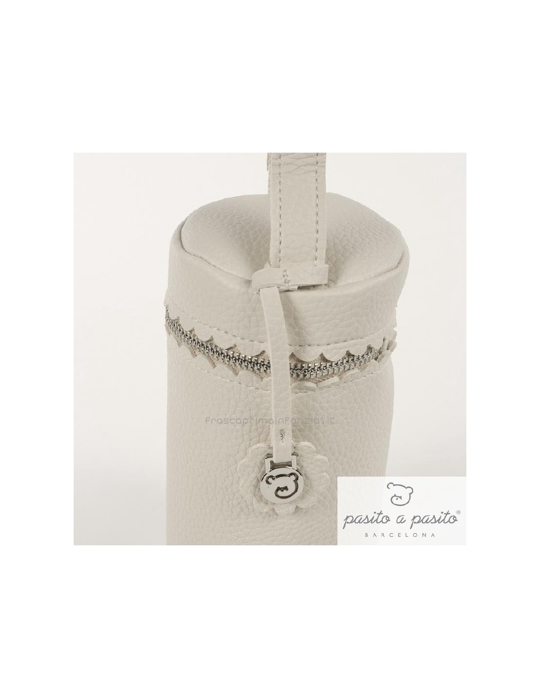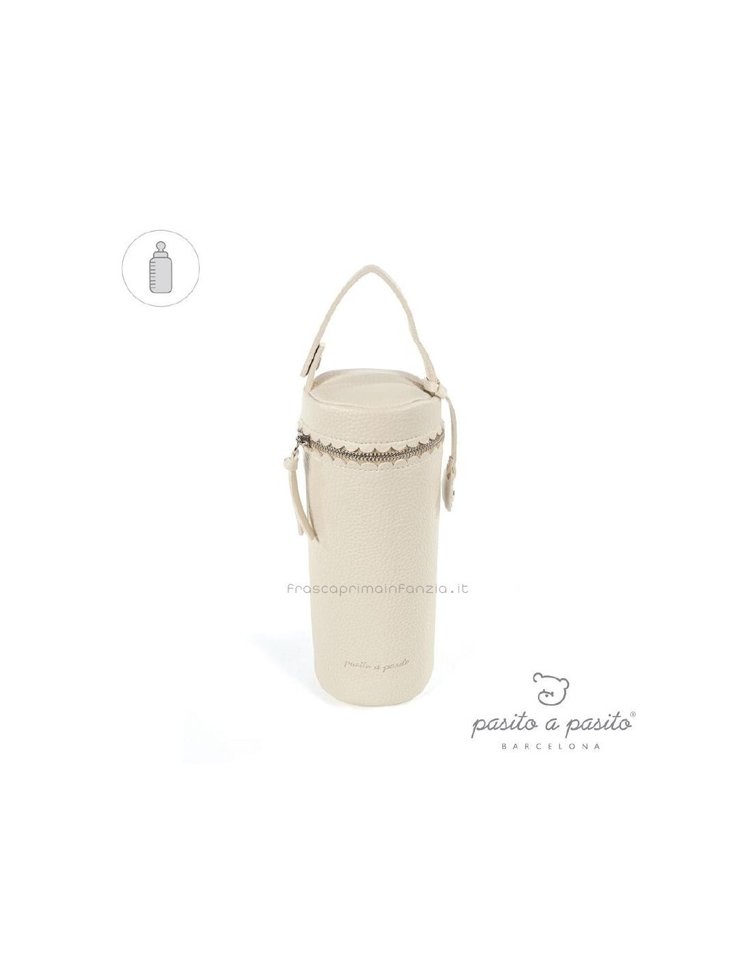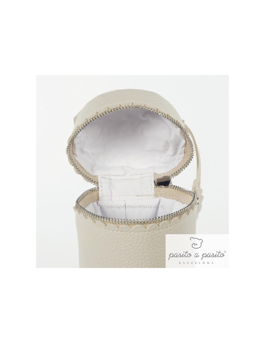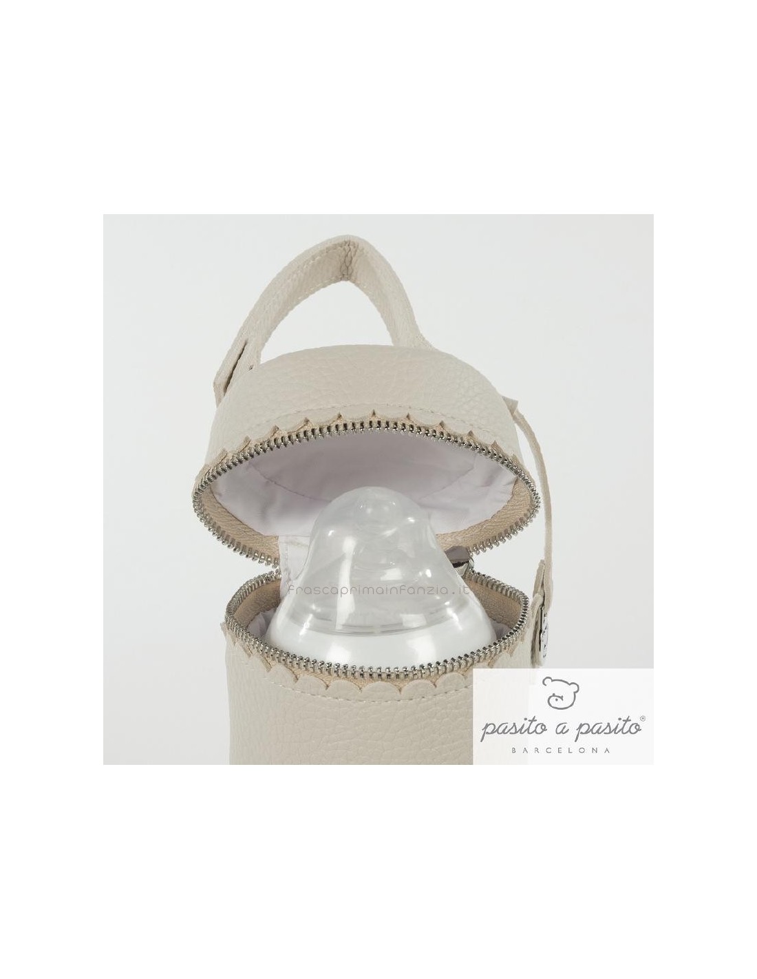Portabiberon Pasito a Pasito della collezione Biscuit.Realizzato in similpelle, consente di mantenere la bottiglia o il thermos di liquidi alla giusta temperatura per un tempo più lungo.Include una maniglia con clip per poter essere appesa nella borsa o al passeggino.