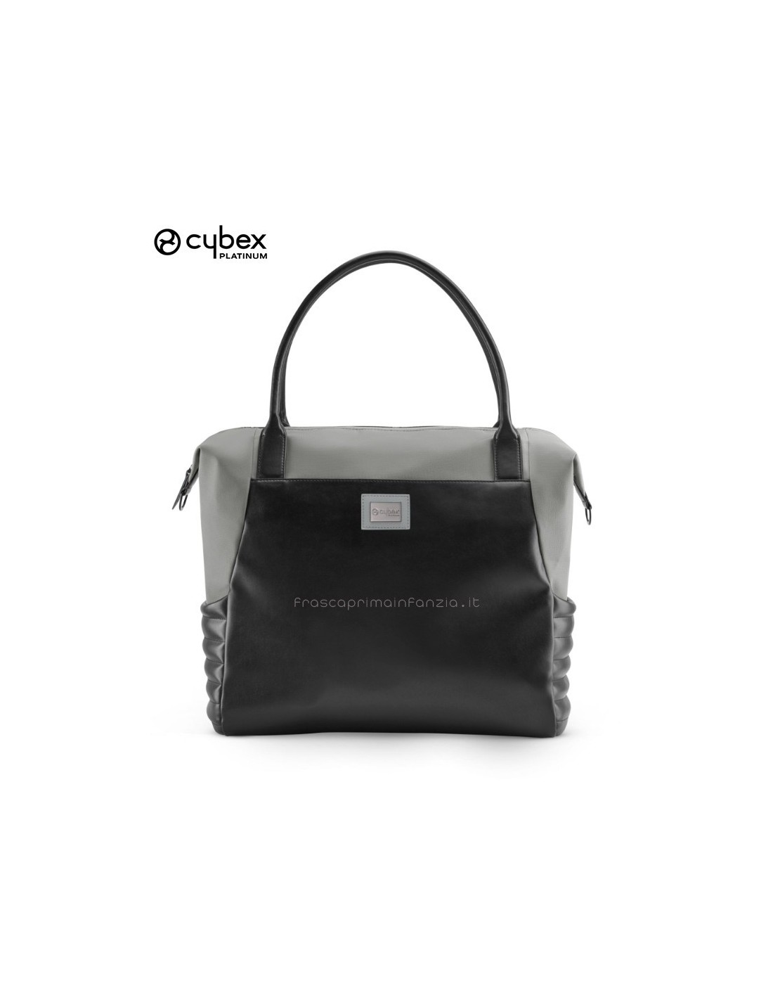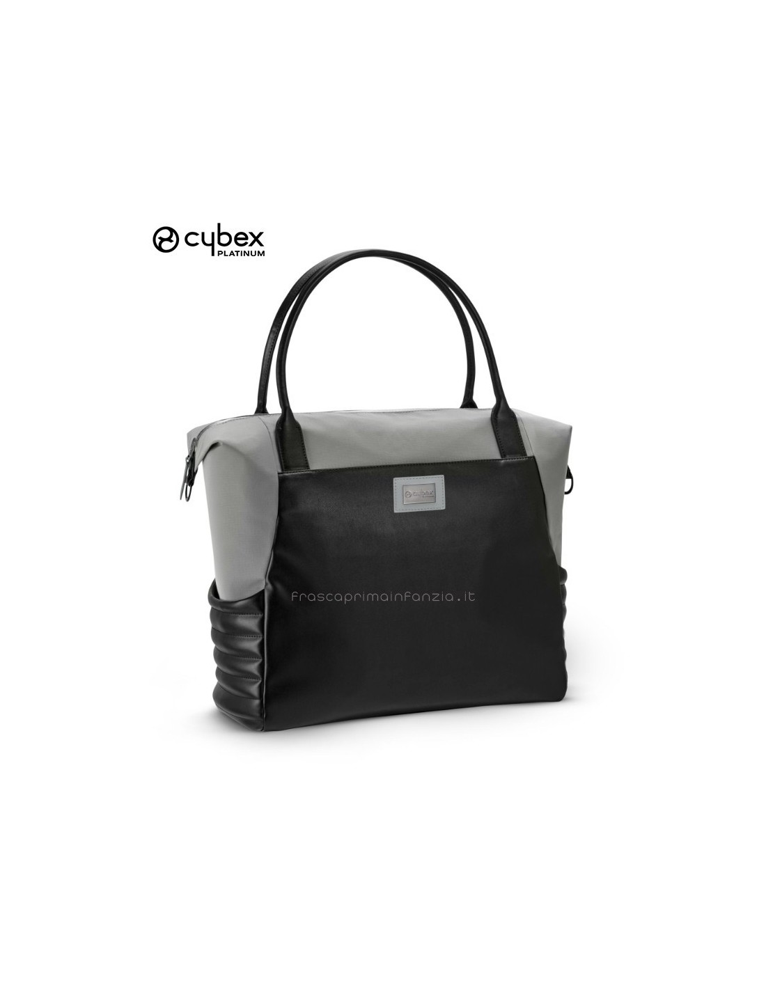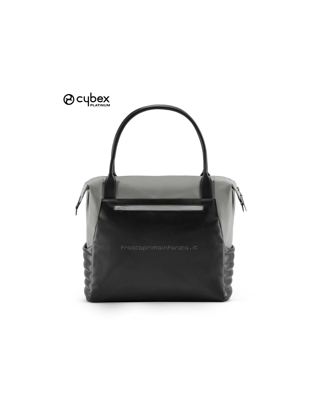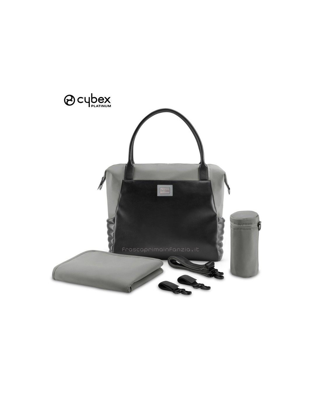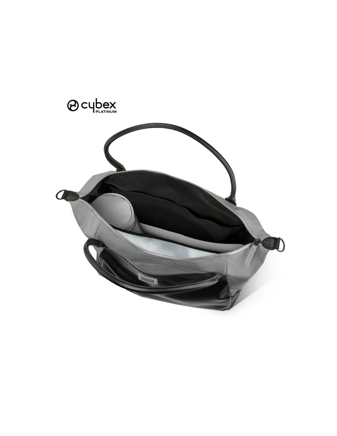 La borsa Shopper CYBEX Platinum è dotata di un porta bevande termico rimovibile, un tappetino per il cambio e uno scomparto per indumenti bagnati.