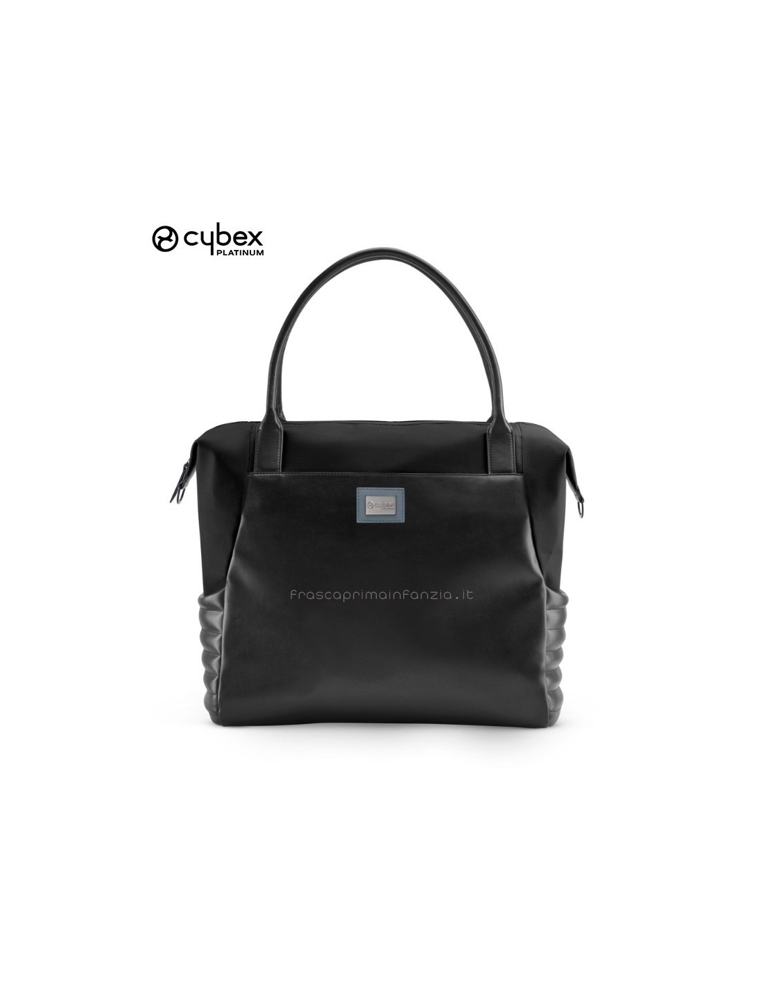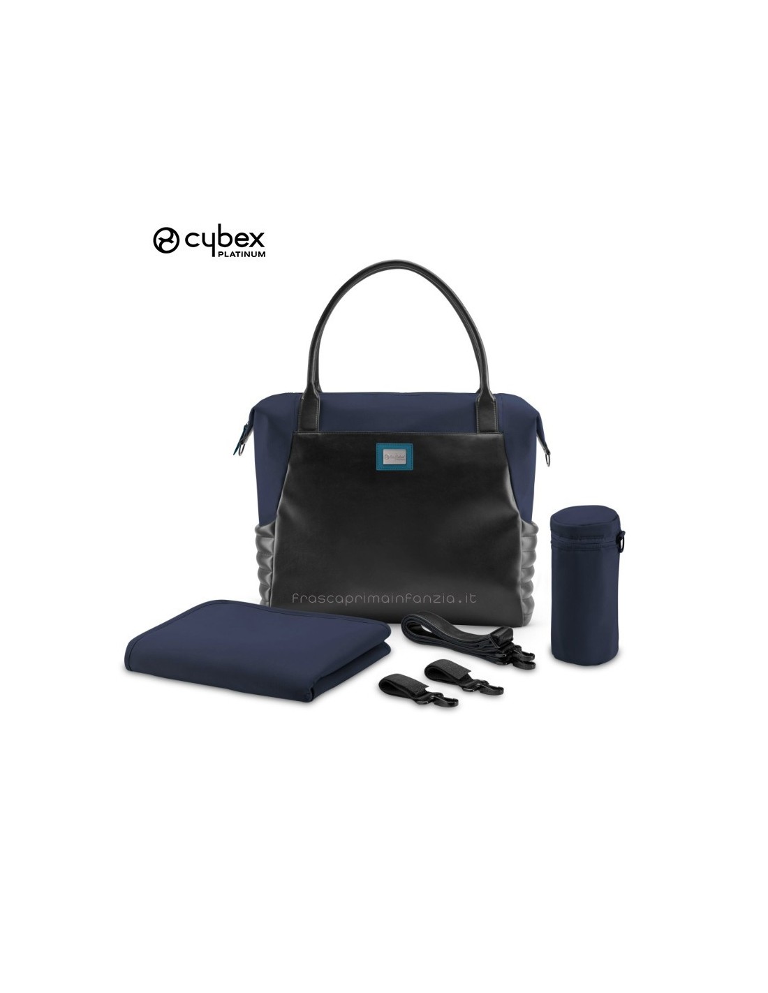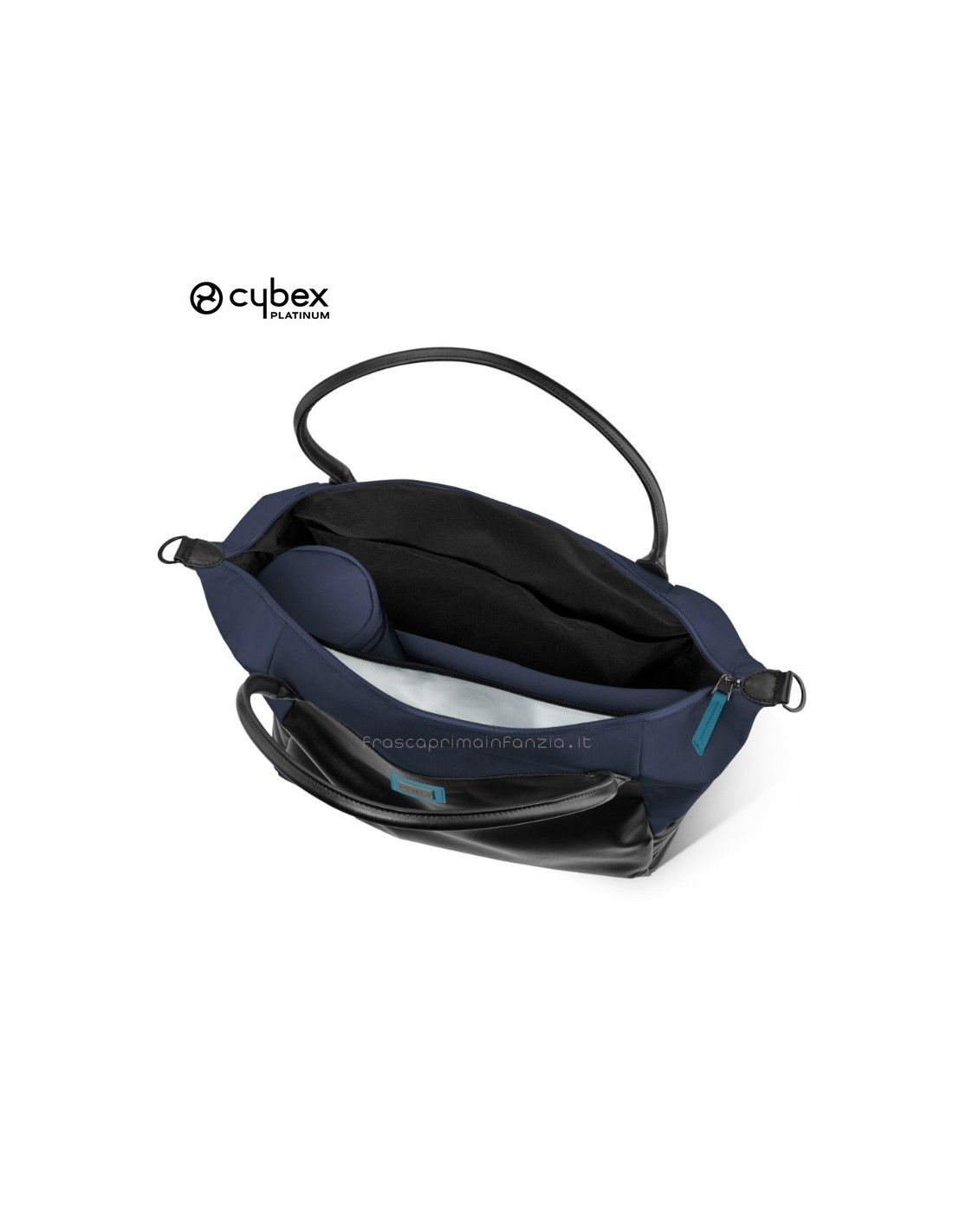 La borsa Shopper CYBEX Platinum è dotata di un porta bevande termico rimovibile, un tappetino per il cambio e uno scomparto per indumenti bagnati.