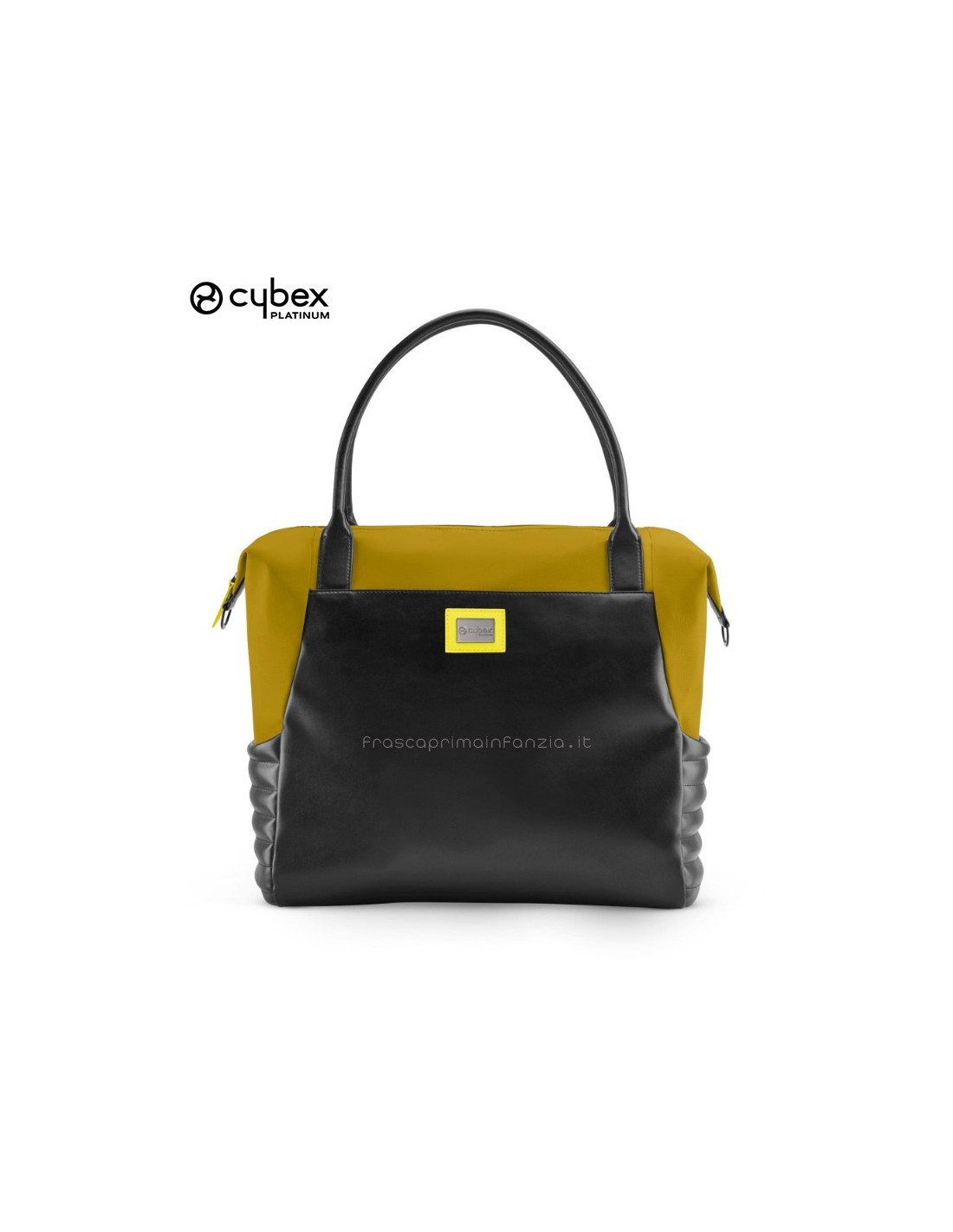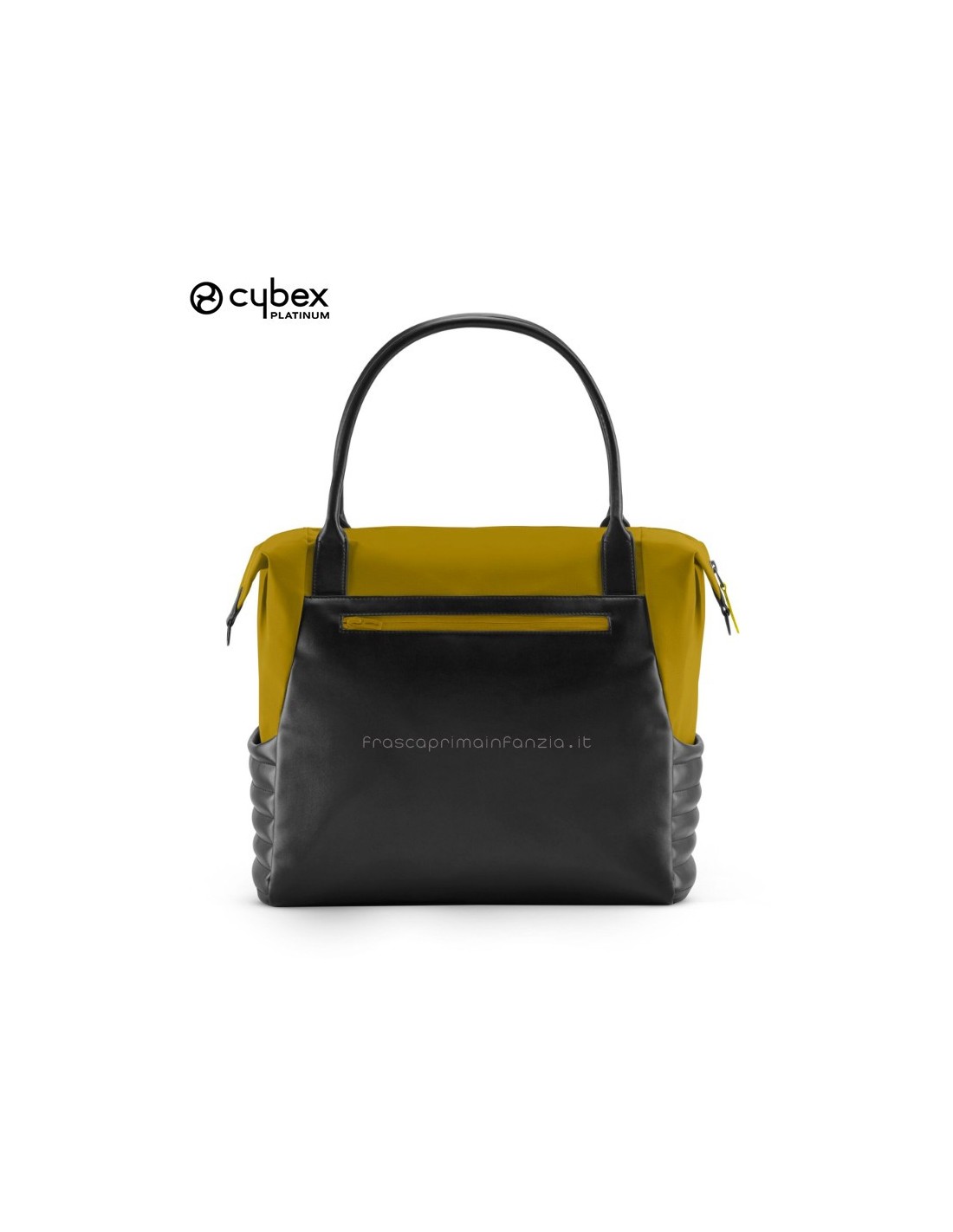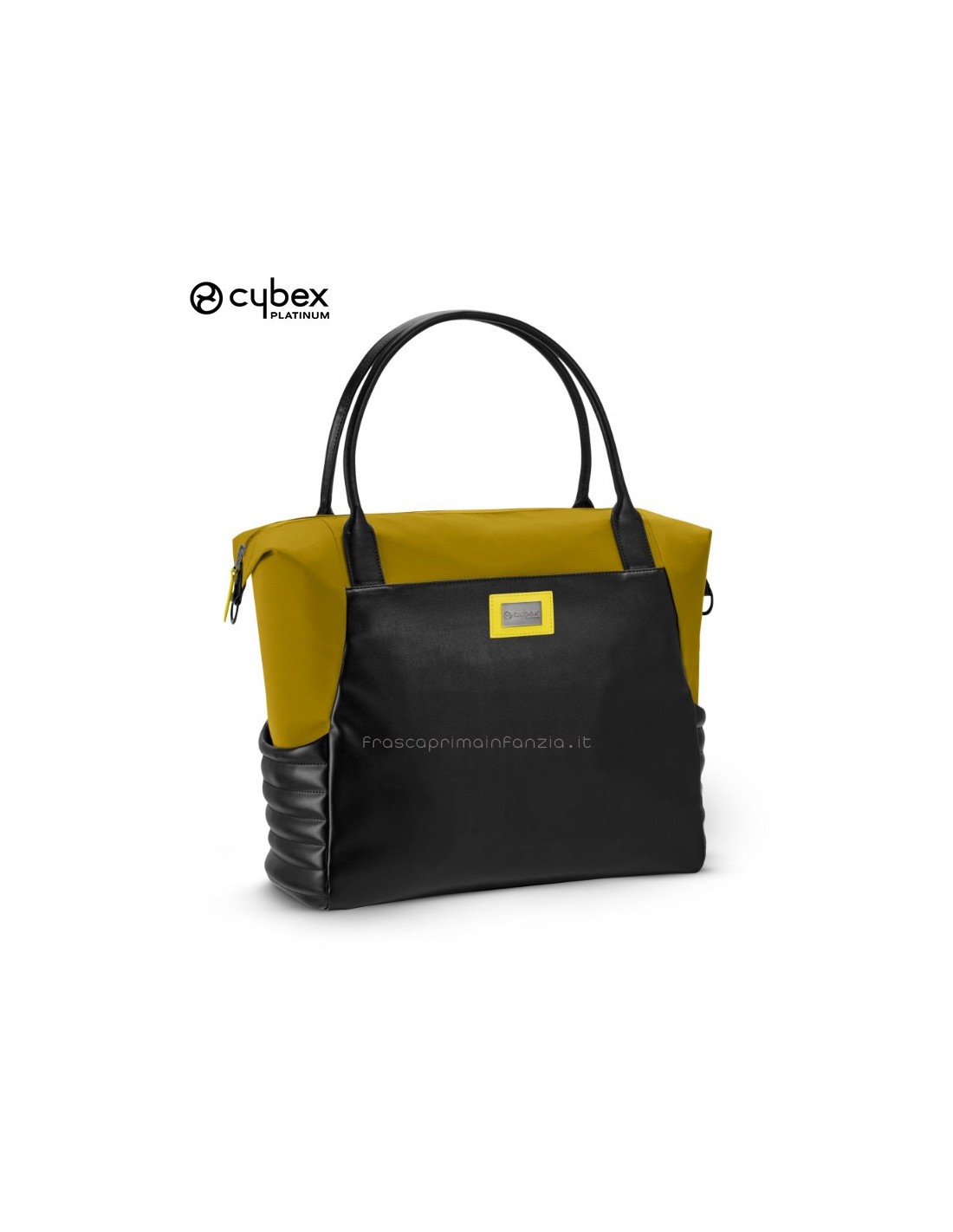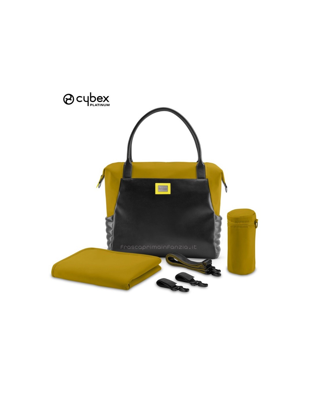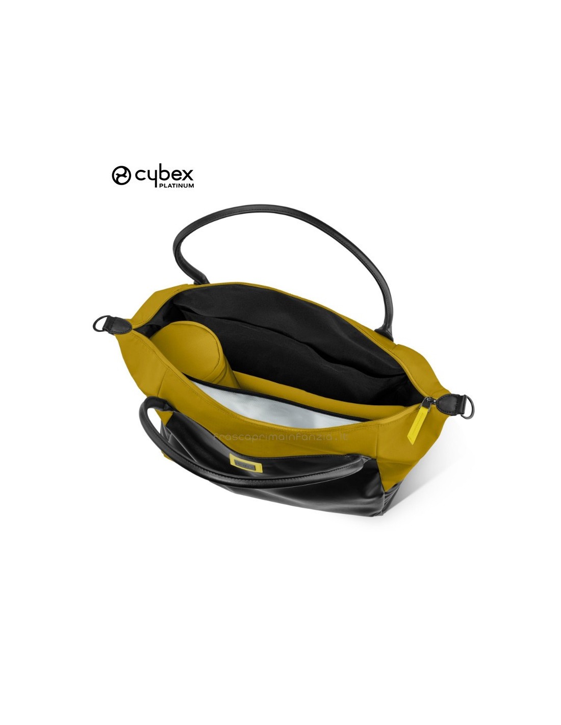 La borsa Shopper CYBEX Platinum è dotata di un porta bevande termico rimovibile, un tappetino per il cambio e uno scomparto per indumenti bagnati.
