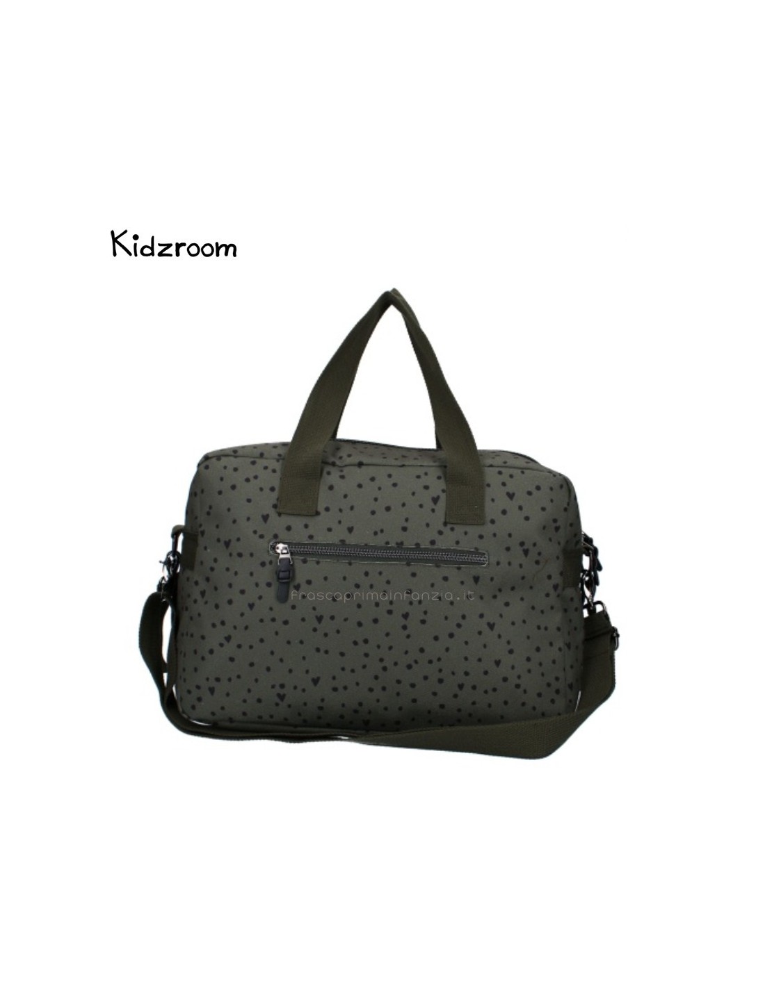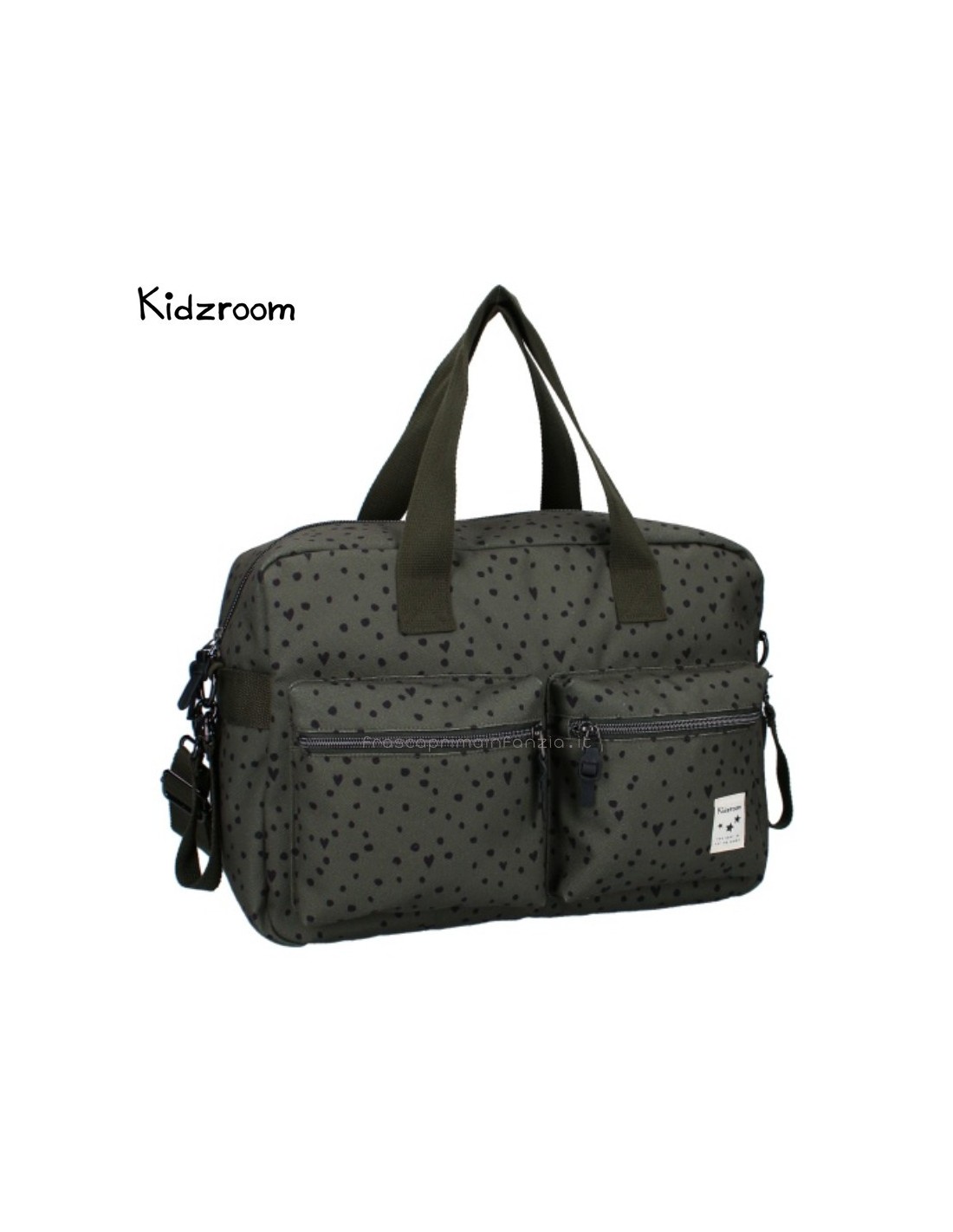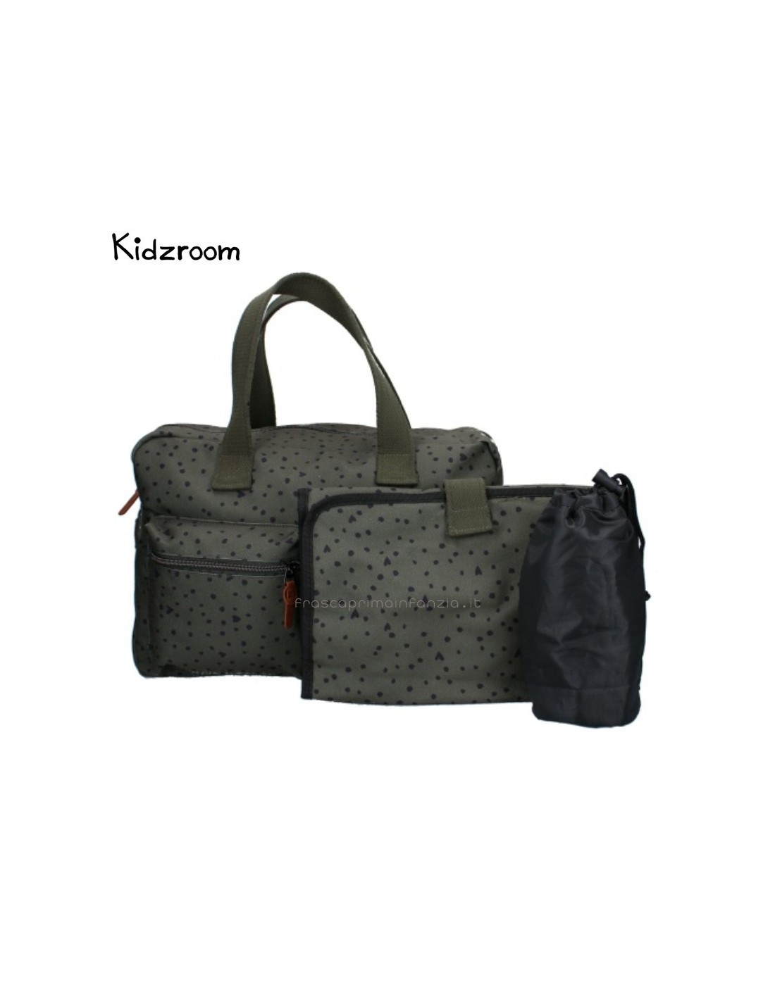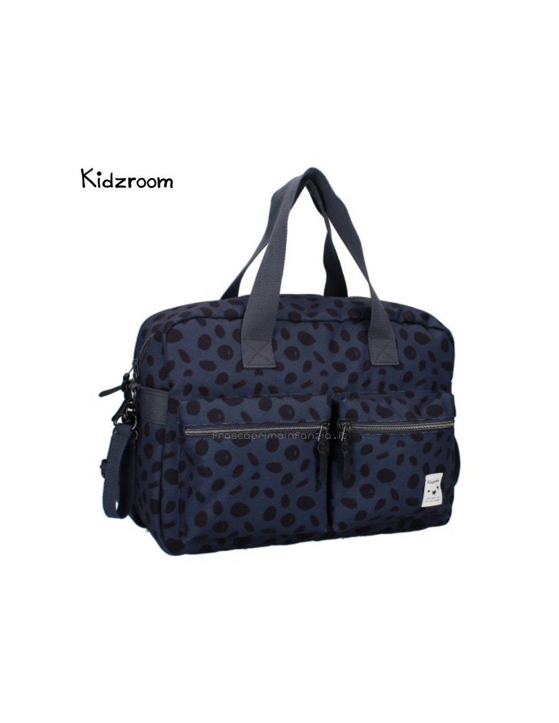 Con questa borsa fasciatoio di tendenza di Kidzroom, potrete portare facilmente gli effetti personali del vostro piccolo ovunque andiate. Questa borsa per pannolini blu scuro con pois neri contiene tutti i pannolini, i panni idrofili, i vestiti extra, i biberon, gli snack e i ciucci necessari per il vostro bambino in viaggio. Le due ampie tasche anteriori consentono di afferrare facilmente gli oggetti necessari. Inoltre, l'ampio scomparto principale è dotato di una doppia cerniera per un facile accesso. Nello scomparto principale si trovano una cerniera e diverse tasche con elastico in cui è possibile riporre facilmente una tazza. Sul retro della borsa per pannolini c'è una cerniera per i piccoli oggetti che non si vogliono perdere.