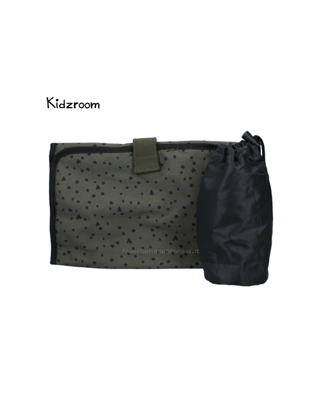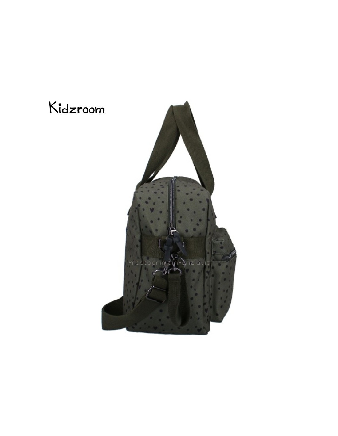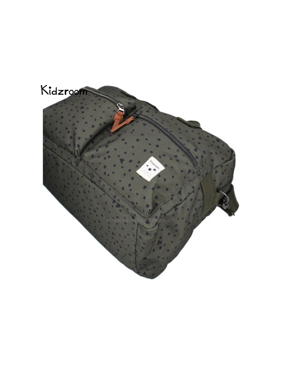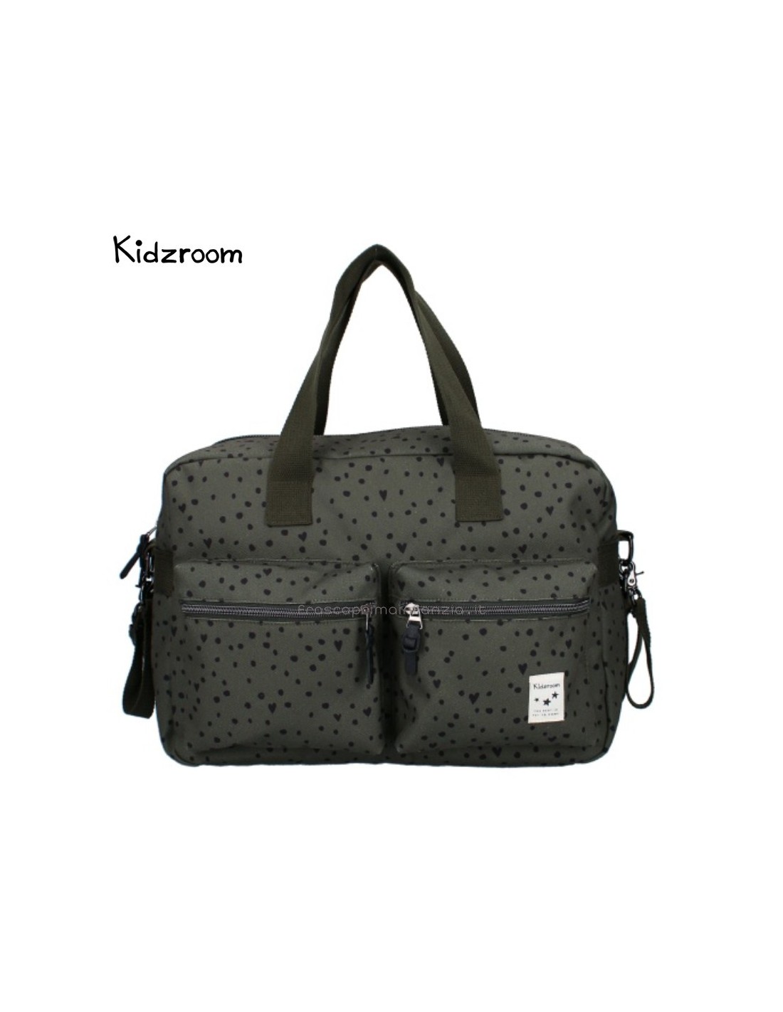 Con questa borsa fasciatoio di tendenza di Kidzroom, potrete portare facilmente gli effetti personali del vostro piccolo ovunque andiate. Questa borsa per pannolini blu scuro con pois neri contiene tutti i pannolini, i panni idrofili, i vestiti extra, i biberon, gli snack e i ciucci necessari per il vostro bambino in viaggio. Le due ampie tasche anteriori consentono di afferrare facilmente gli oggetti necessari. Inoltre, l'ampio scomparto principale è dotato di una doppia cerniera per un facile accesso. Nello scomparto principale si trovano una cerniera e diverse tasche con elastico in cui è possibile riporre facilmente una tazza. Sul retro della borsa per pannolini c'è una cerniera per i piccoli oggetti che non si vogliono perdere.