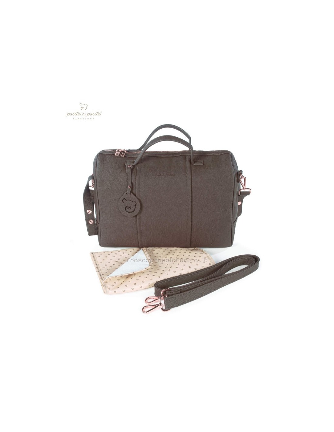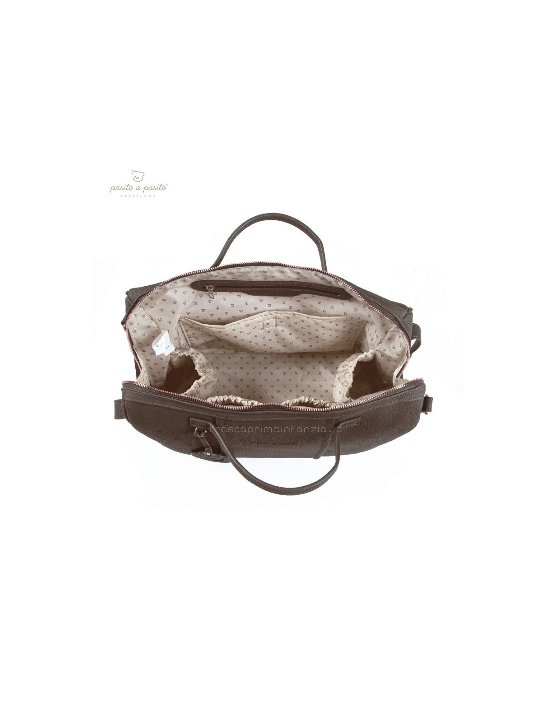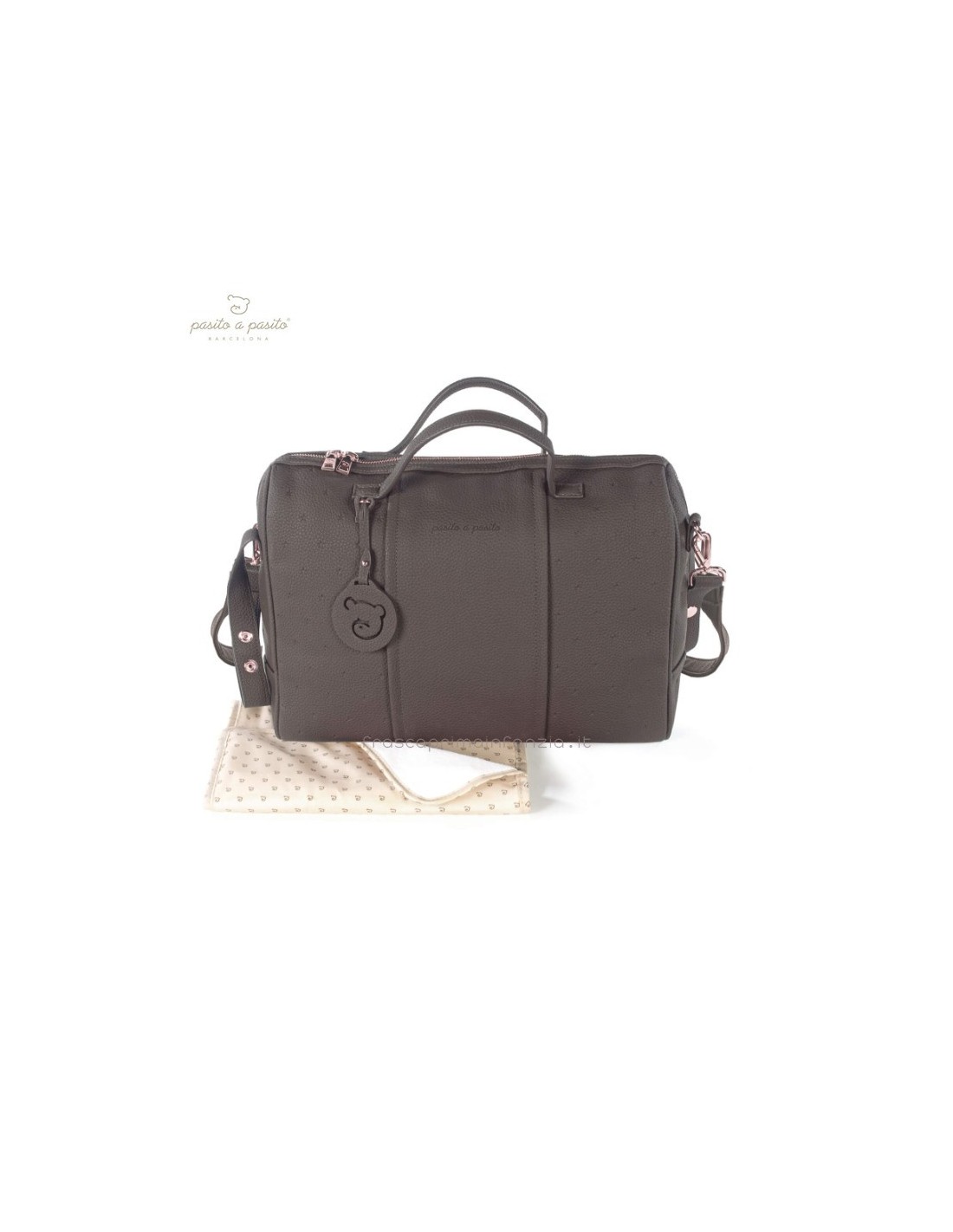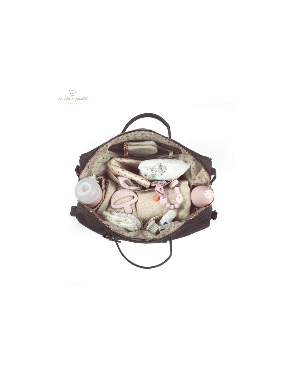 Borsa fasciatoio o borsa per passeggino London in similpelle nera con stelle, molto elegante e pratica, per portare tutto quanto serve al tuo bambino. Include maniche lunga per appenderla alla spalla e manica corte per portarla alla ecarrozzina. Fodera interna con tasche. Si puoÌ lavare a mano o in lavatrice a 30º. I materiali utilizzati sono esenti di coloranti azoici, ftalati e sostanze nocive alla salute. Dimensioni: 38X28X16 cm. Borse cambio Pasito a pasito.