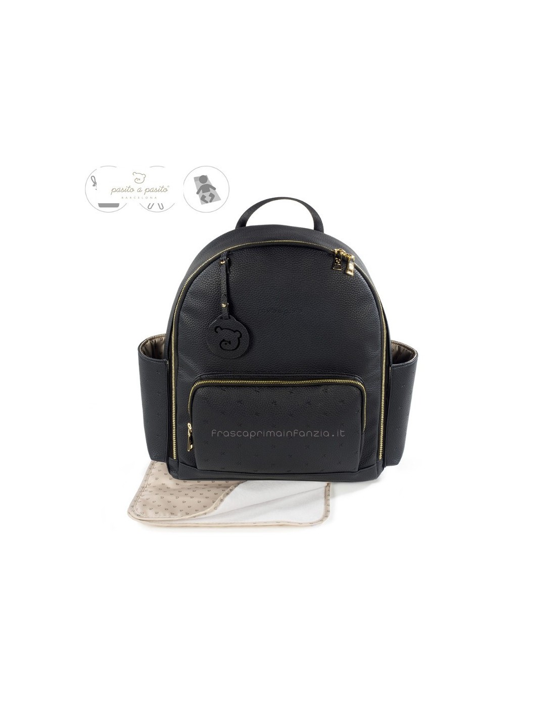 Zaino London in similpelle nera con stelle. Grande capacità di trasportare tutto cioÌ di cui tu e il tuo bambino avete bisogno. Tasche interne ed esterne per avere tutto a portata di mano e in ordine. Scomparto per laptop o tablet. Ha 2 grandi maniglie regolabili in modo da poterlo utilizzare appeso sul retro e altre due piccole maniglie in modo da poterlo appendere sul carrello del bambino. Si adatta alla valigia della cabina. Si puoÌ lavare a mano o in lavatrice a 30º. I materiali utilizzati sono esenti di coloranti azoici, ftalati e sostanze nocive alla salute. Dimensioni: 32X37X15 cm. Borse cambio Pasito a pasito.
