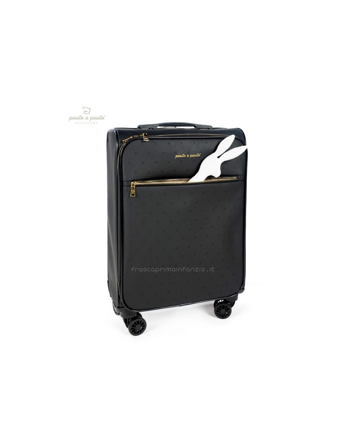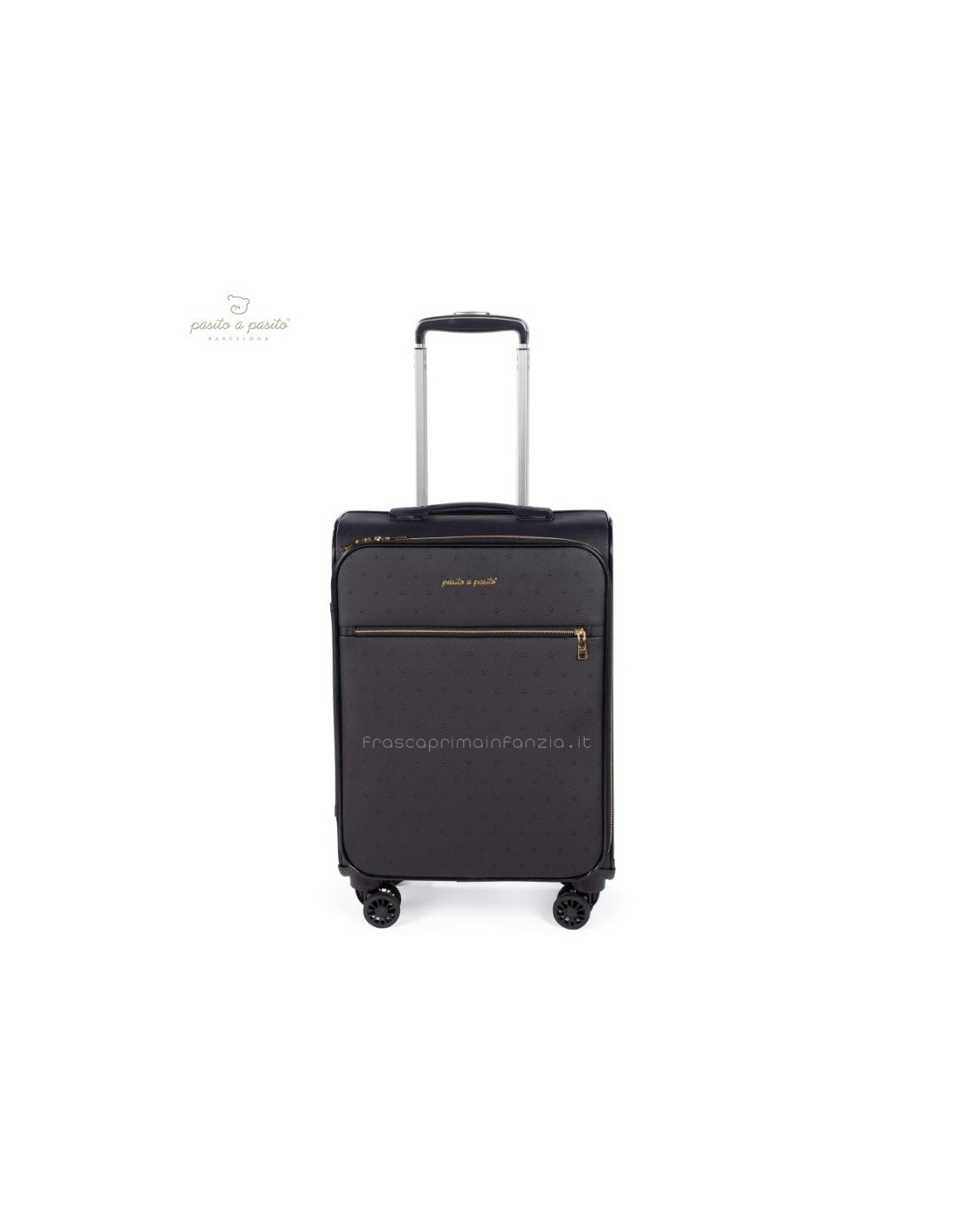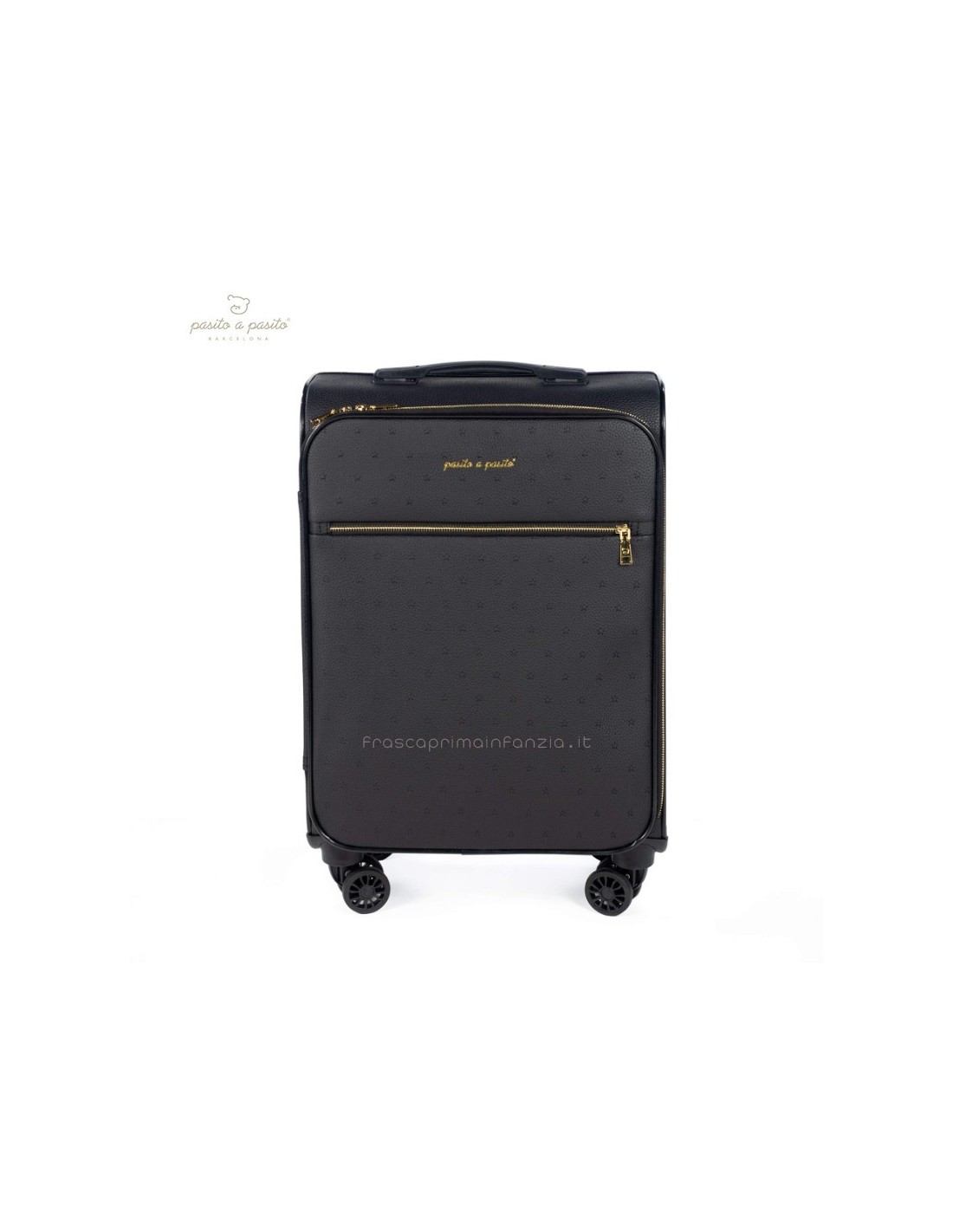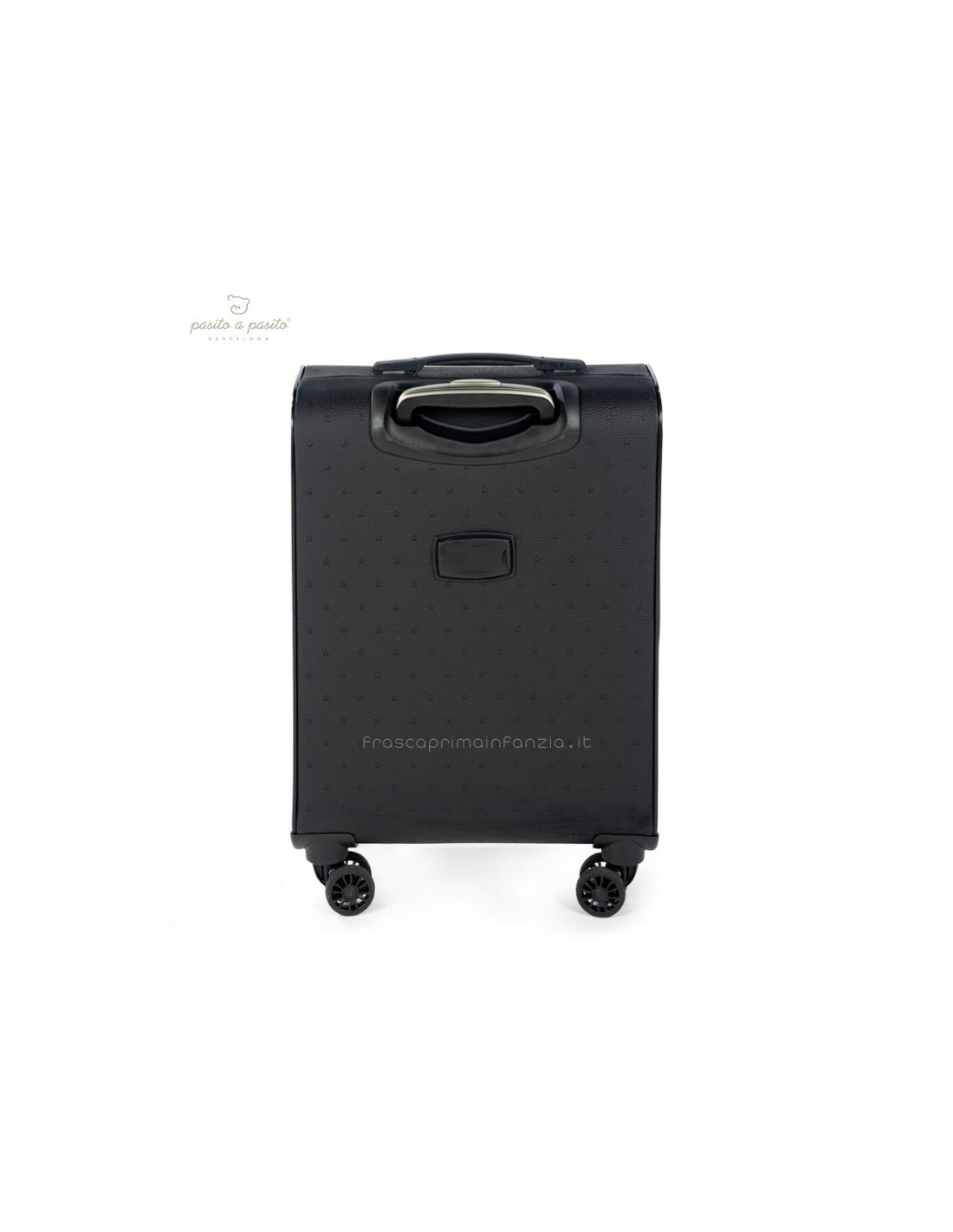 Valigia da cabina in ecopelle nera con stelle incise. Ruote multidirezionali per un comodo movimento. Ha uno scomparto interno con elastici e una tasca con cerniera sul coperchio in modo che tutto sia ben organizzato. Ha anche una tasca esterna con cerniera per tenere gli elementi essenziali a portata di mano. Manico telescopico a due posizioni. Include una targhetta con il nome sul retro. I materiali utilizzati sono privi di coloranti azoici, ftalati e sostanze nocive per la salute. Dimensioni: 35,5x45x21 cm.