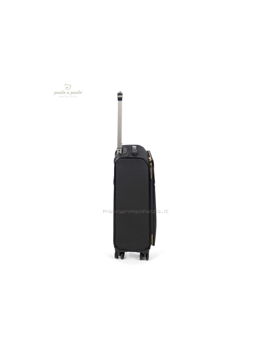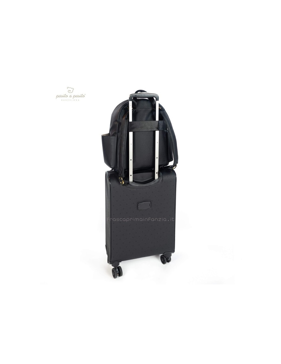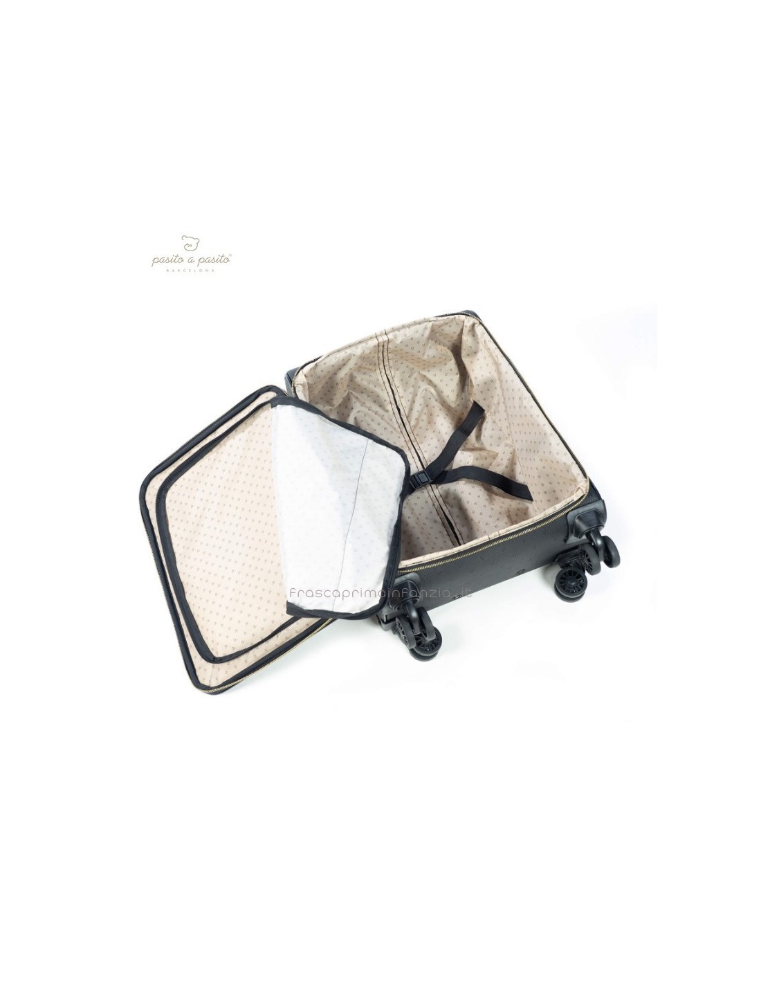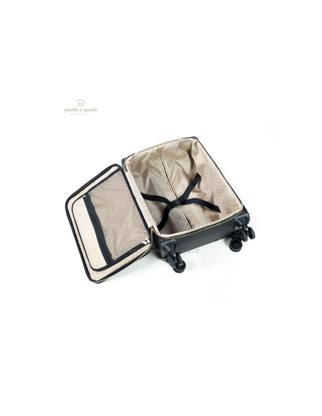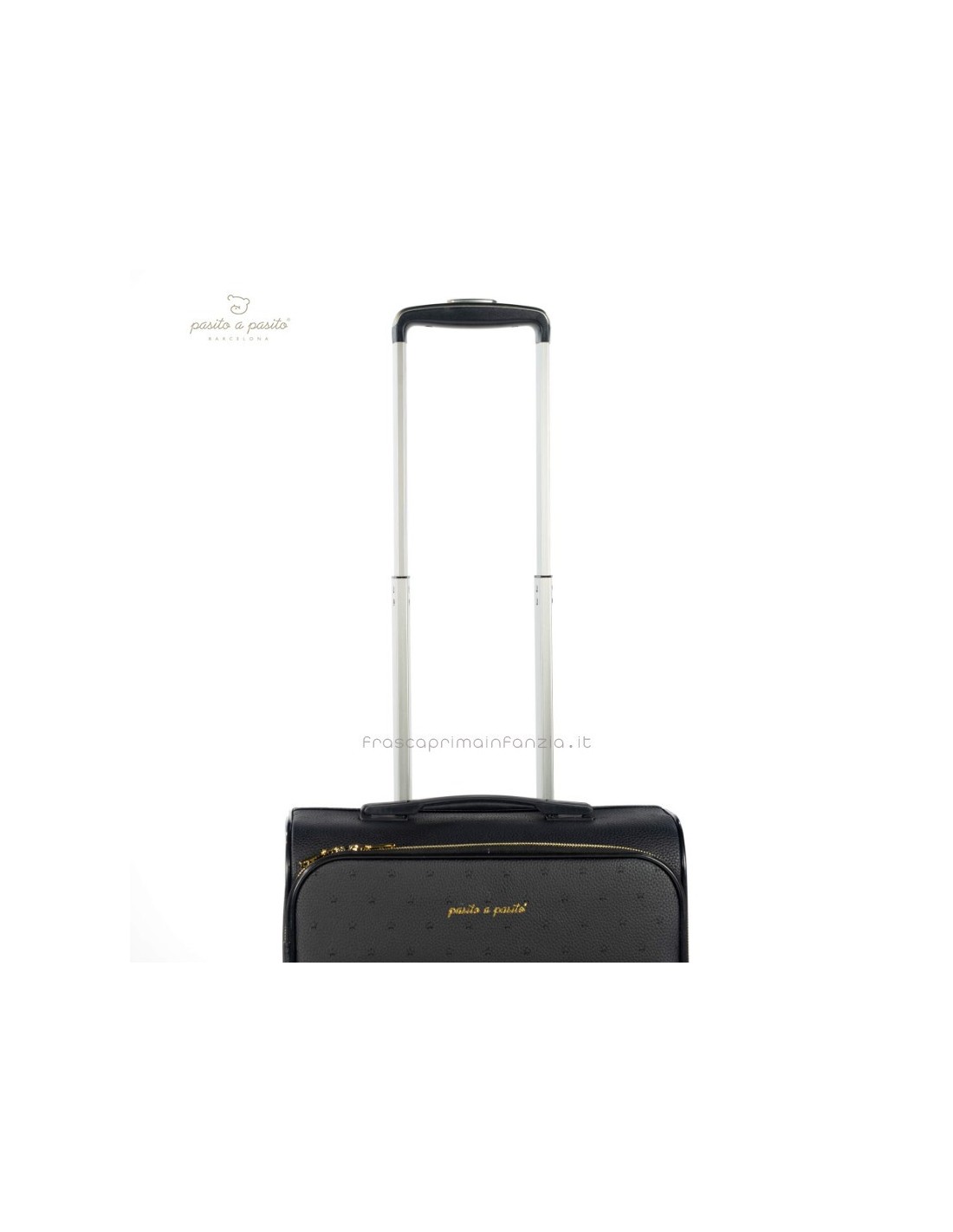 Valigia da cabina in ecopelle nera con stelle incise. Ruote multidirezionali per un comodo movimento. Ha uno scomparto interno con elastici e una tasca con cerniera sul coperchio in modo che tutto sia ben organizzato. Ha anche una tasca esterna con cerniera per tenere gli elementi essenziali a portata di mano. Manico telescopico a due posizioni. Include una targhetta con il nome sul retro. I materiali utilizzati sono privi di coloranti azoici, ftalati e sostanze nocive per la salute. Dimensioni: 35,5x45x21 cm.