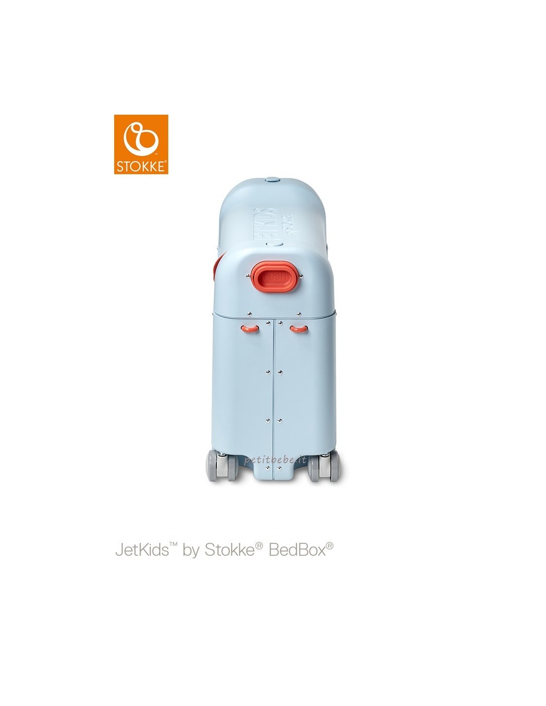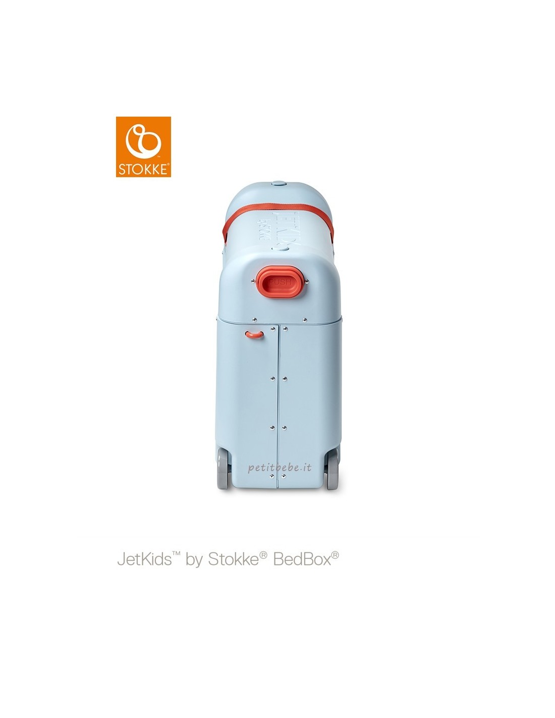 Stokke Jetkids Bedbox è la favolosa valigia cavalcabile che  in volo si trasforma in un lettino dove dormire comodamente.