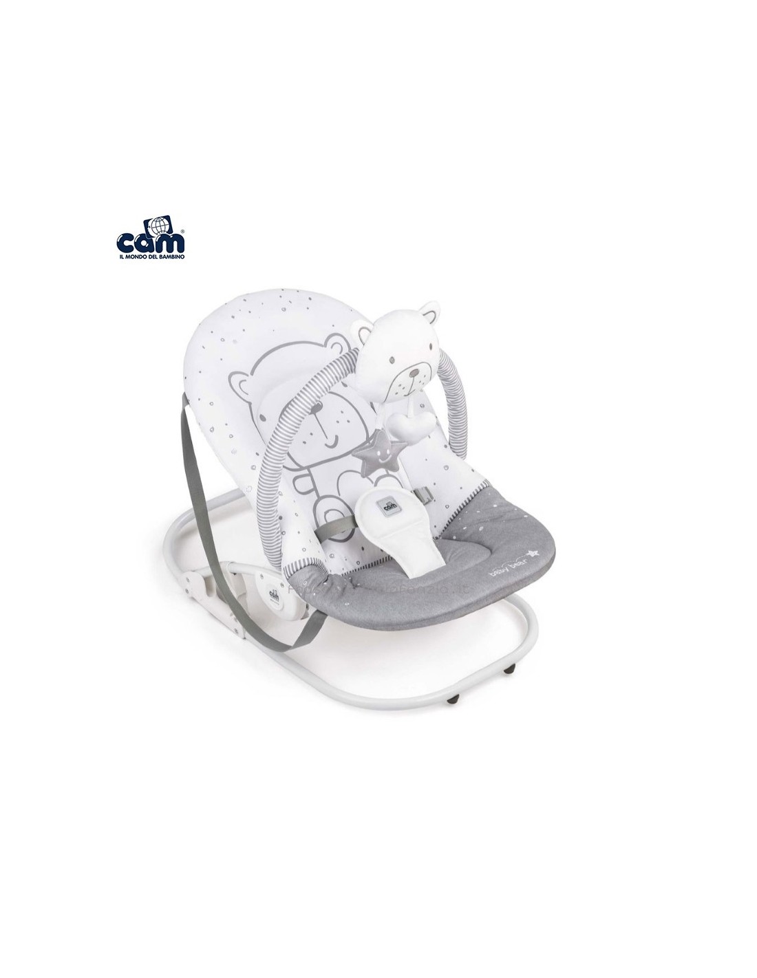 La Sdraietta Giocam può essere bloccata(fissa) grazie ai 2 piedini di appoggio o dondolare manualmente grazie alla base a dondolo con gommini antiscivolo.