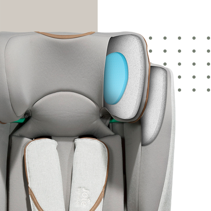 La protezione dagli impatti laterali Tri-Protect™, realizzata in memory foam Intelli-Fit™, una tecnologia all’avanguardia, è in grado di assorbire gli urti, proteggendo la testa e il collo del bambino in caso di collisione.